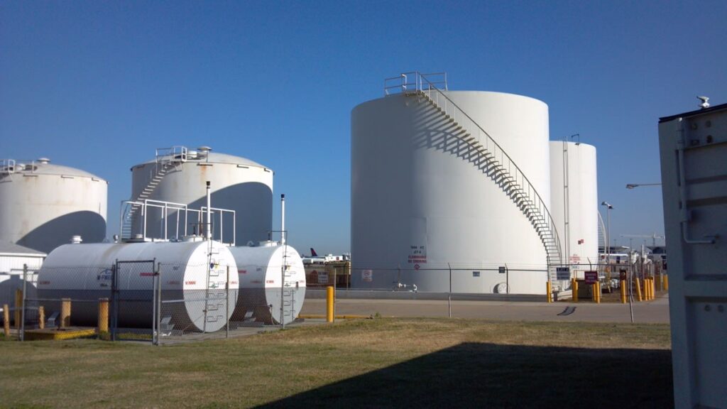 Tanques y depósitos para almacenar petróleo crudo y productos refinados.